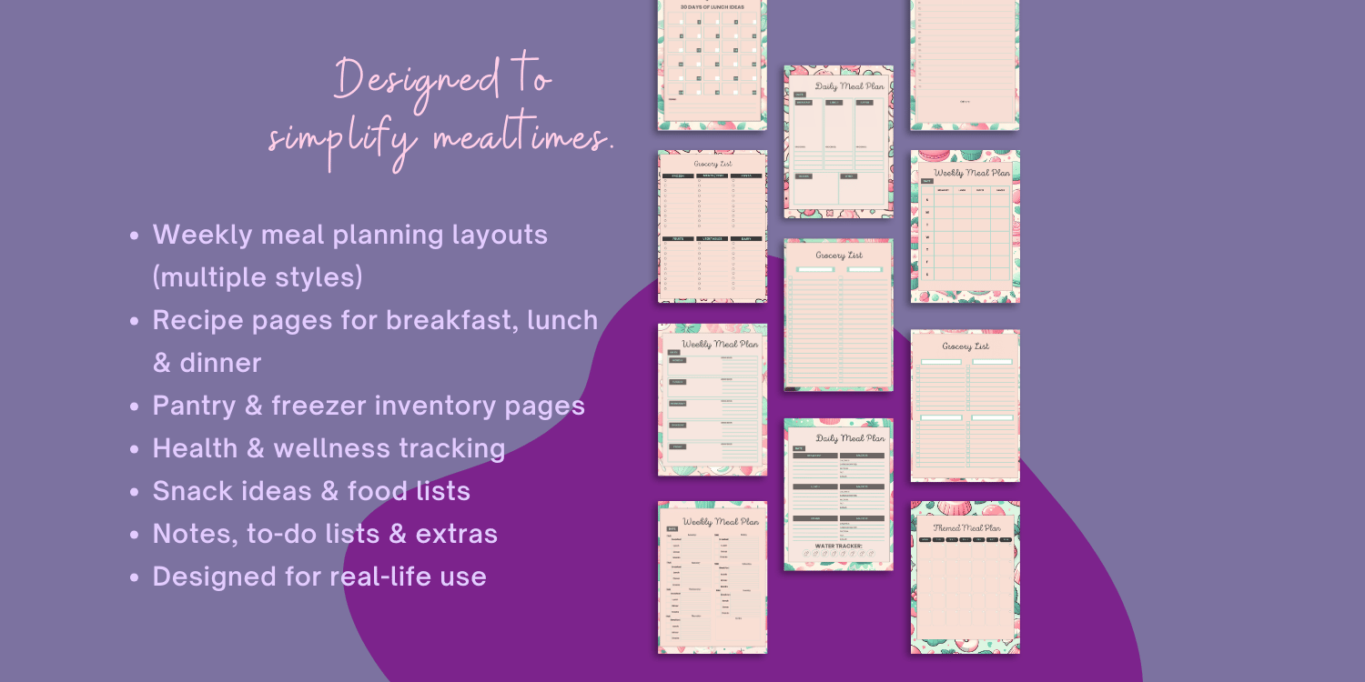 This 50-page printable meal planner is a fun, practical way to organize meals, save time, and bring a little calm to everyday life.